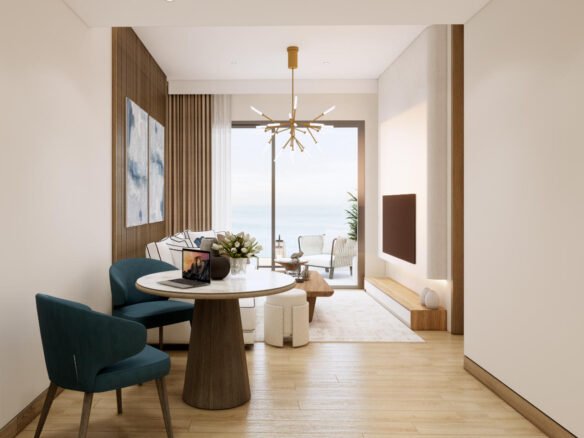 – Two-bedroom residences in two configurations: elevated sea-view units on Floors 2–4 (87.73 sqm) and ground-floor sea-view units with private pool and garden (151.16 sqm total, including outdoor area)