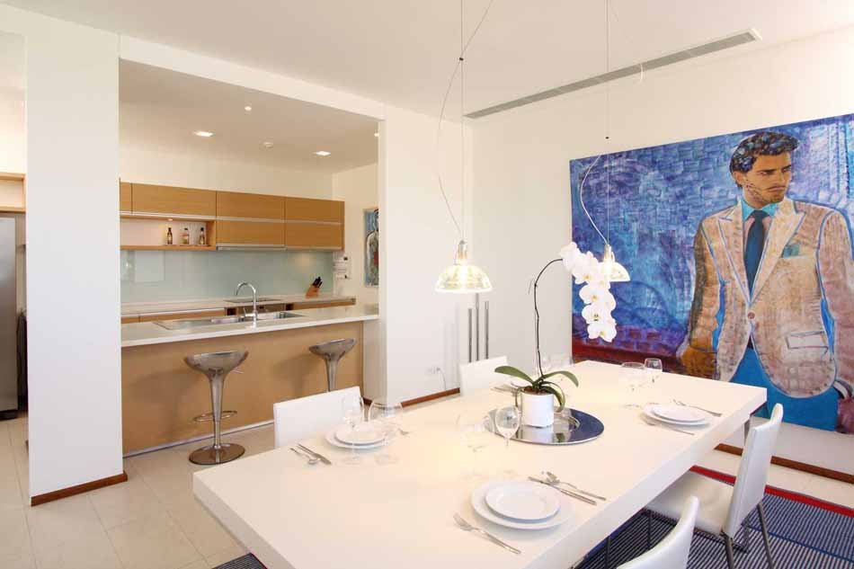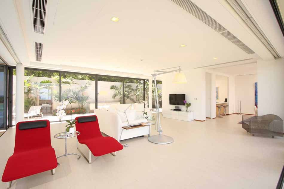 Full length, folding glass doors provide an amazing semi-outdoor effect to the open living space. Hardly needed yet air-conditioned throughout. Dividing the dining area is the breakfast bar and the fabulously modern kitchen equipped with all European appliances. All bedrooms are at the lower level, also with spectacular sea views, even from shower. Fully furnished.