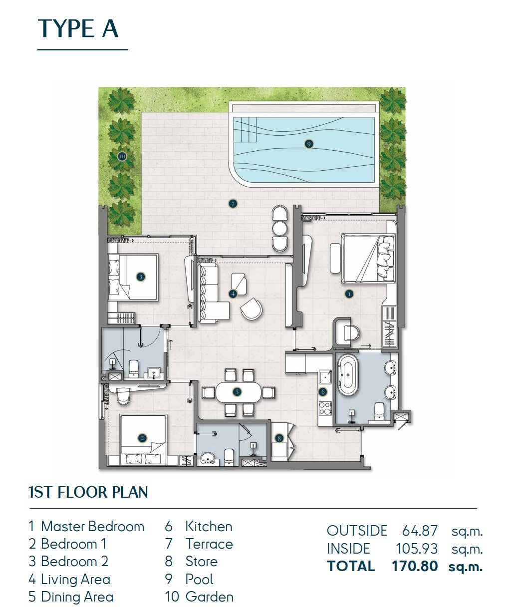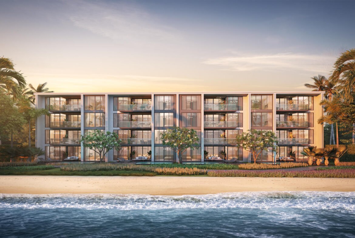 The three-bedroom residences are available in two distinct configurations to suit varied lifestyles: sea-view units on Floors 2–4 (114.87 sqm) providing elevated Andaman Sea panoramas, and ground-floor sea-view units (170.80 sqm total, including private outdoor pool and garden area) that offer direct, exclusive access to the beach and private poolside living.