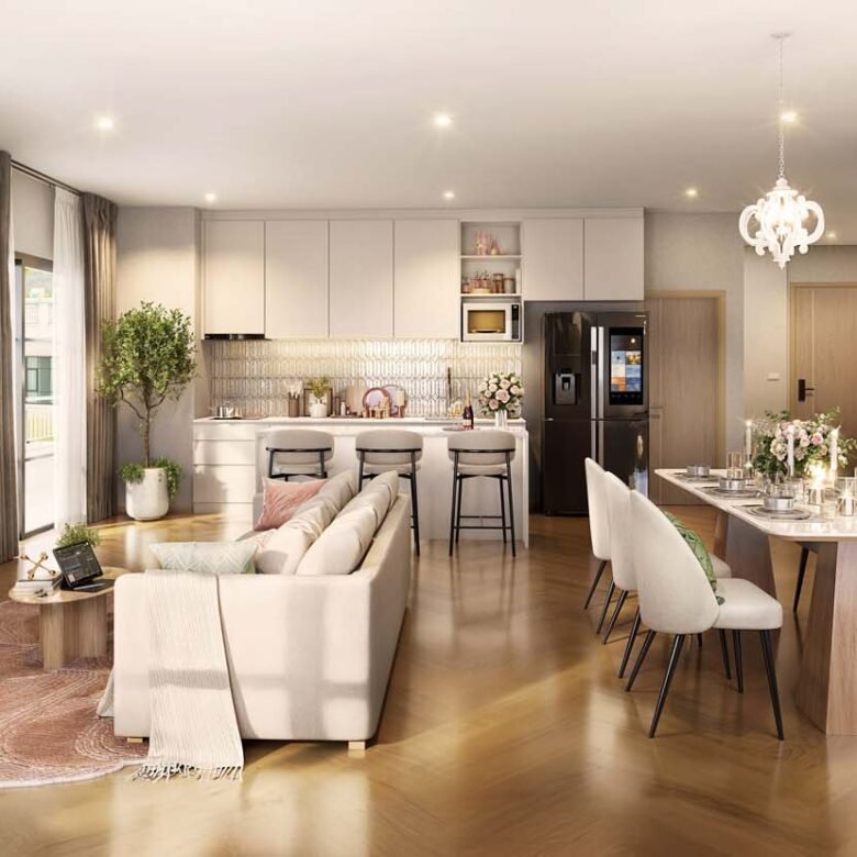 The heart of the home is the open living-dining-kitchen zone—spacious enough for relaxed meals, entertaining, or family movie nights. Both bedrooms are well-proportioned (often with one en-suite), offering privacy and convenience, while dual bathrooms keep mornings smooth. A large balcony (10–12 sqm or more) extends your living outdoors—perfect for barbecues, morning yoga, or simply enjoying panoramic views of greenery and sea.