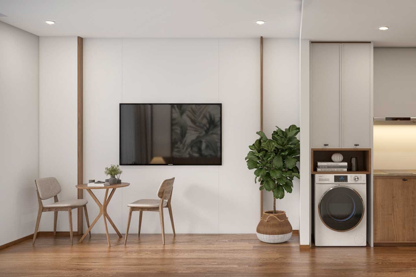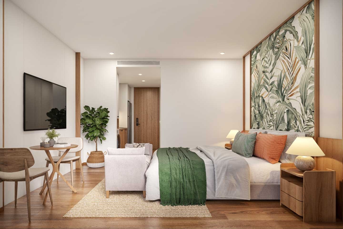 The layout is open and intelligent: a single flowing space that seamlessly combines living, sleeping, and dining areas. A modern kitchenette with quality appliances and ample counter space makes light meals effortless, while the luxurious bathroom features a rain shower, premium fittings, and generous storage. High ceilings and large windows invite natural light and gentle sea breezes, and the private balcony becomes your personal outdoor sanctuary—perfect for sunrise coffee or unwinding with a glass of wine as the garden lights come on.