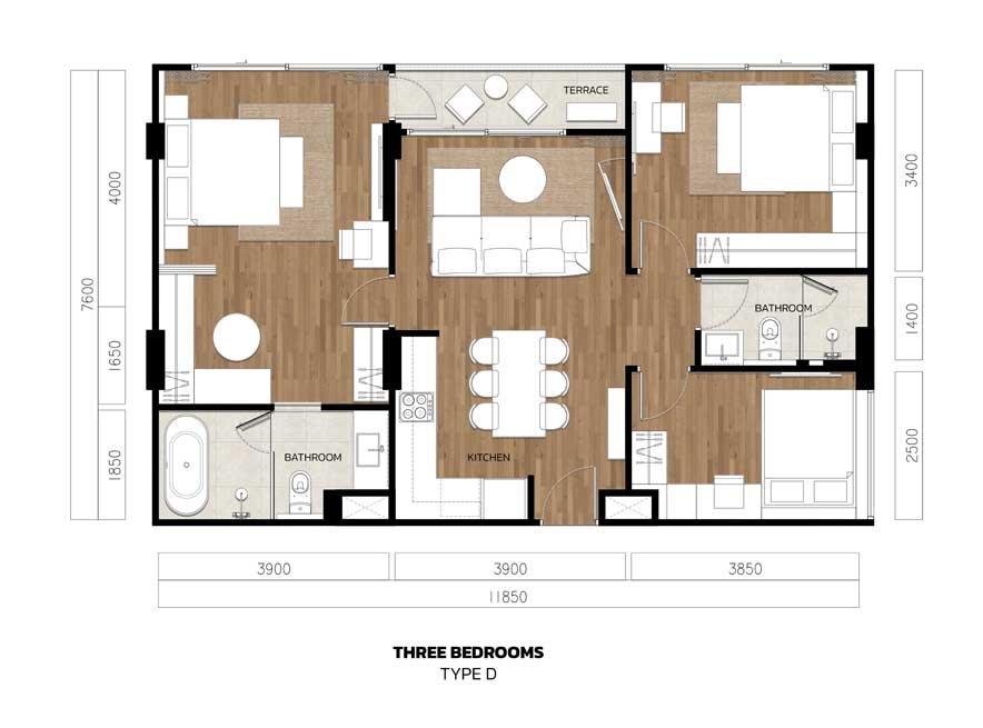 The three-bedroom apartments are designed for those who want space to spread out while staying connected to the beach lifestyle. At 90 square meters, these are the largest standard units in the development, offering genuine room for family life or comfortable multi-generational stays.