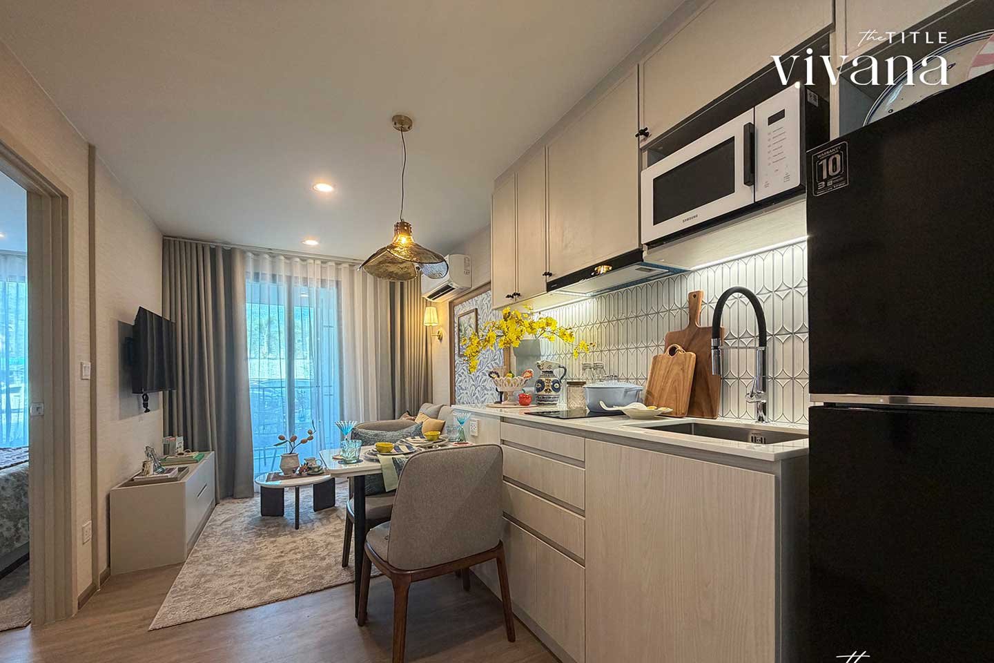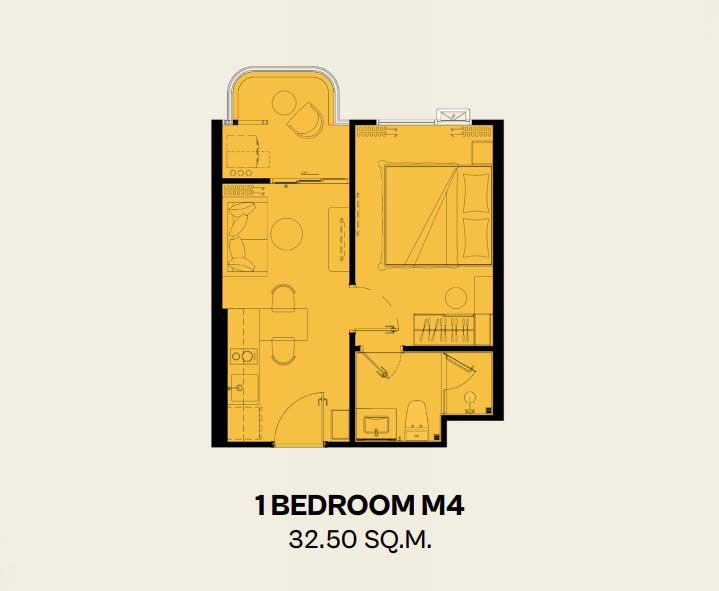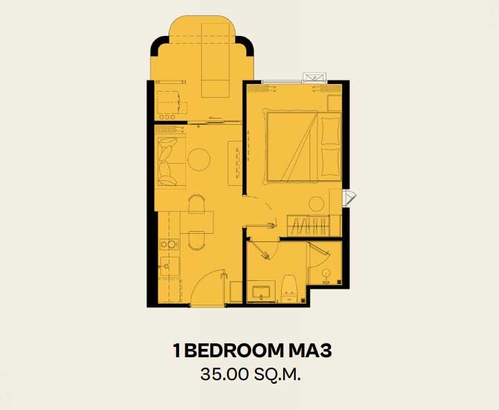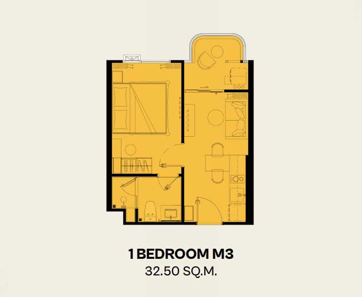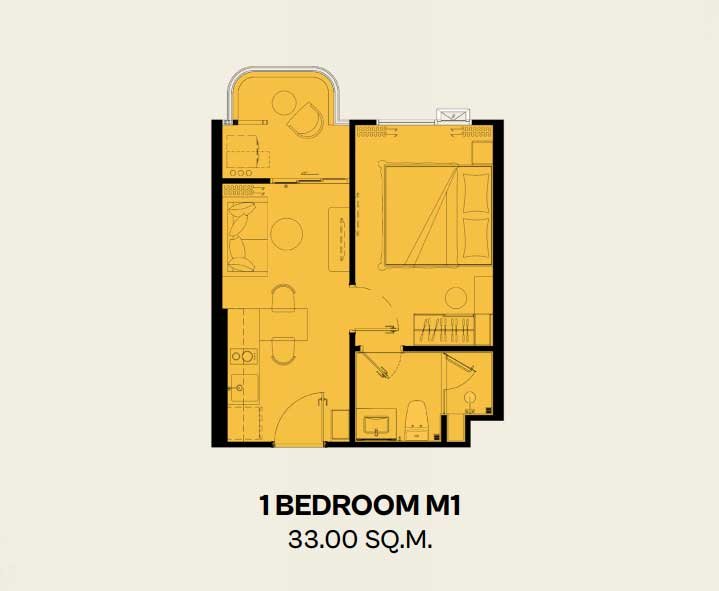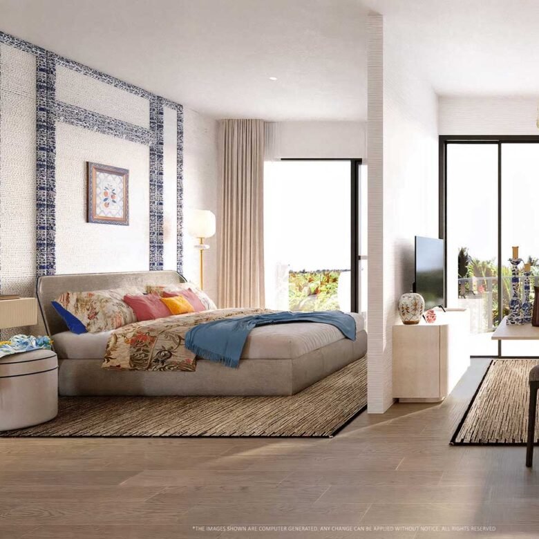 Inspired by the Amalfi Coast, the architecture features curved balconies and bright welcoming facades. The open-plan living area flows naturally into the dining space and efficient kitchenette. Floor-to-ceiling windows frame views of lush gardens or sparkling pools, while the generous balcony comfortably fits a café table and chairs for alfresco breakfasts or evening wine. The bedroom provides a private sanctuary with ample wardrobe space and direct balcony access. The premium bathroom is finished to create a spa-like atmosphere. Every proportion feels elegant and inviting, making the home warm and resort-like from the first step inside.