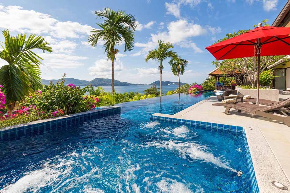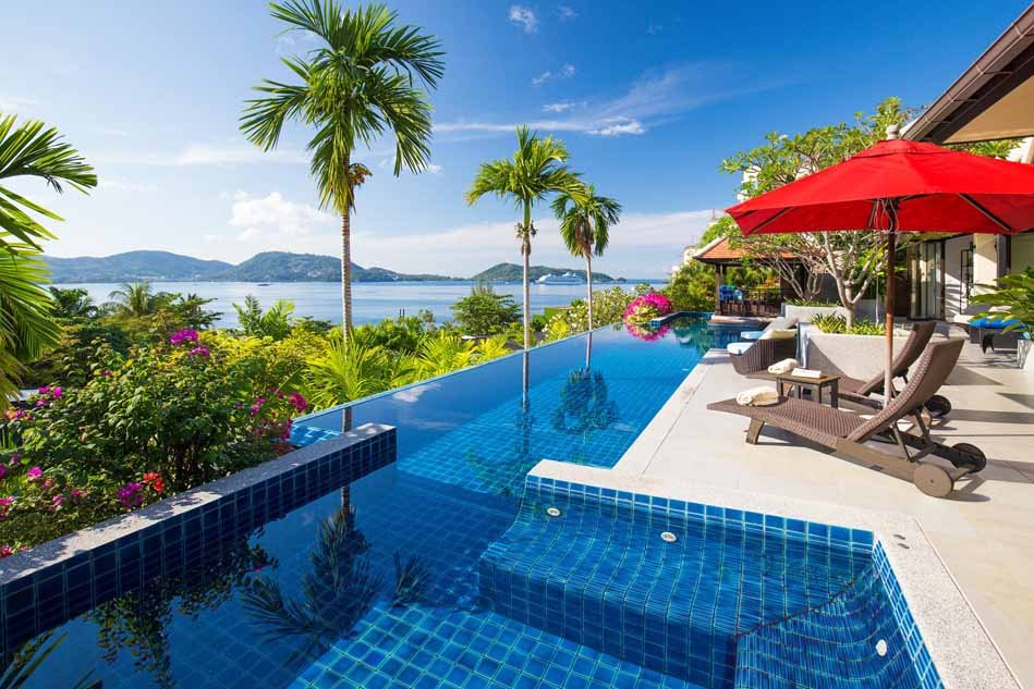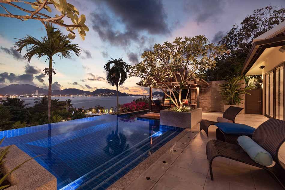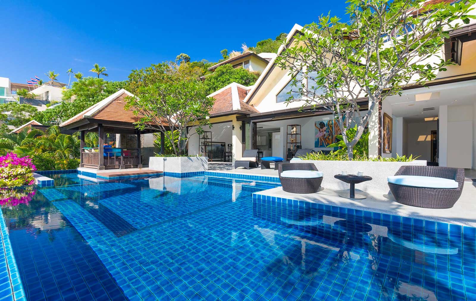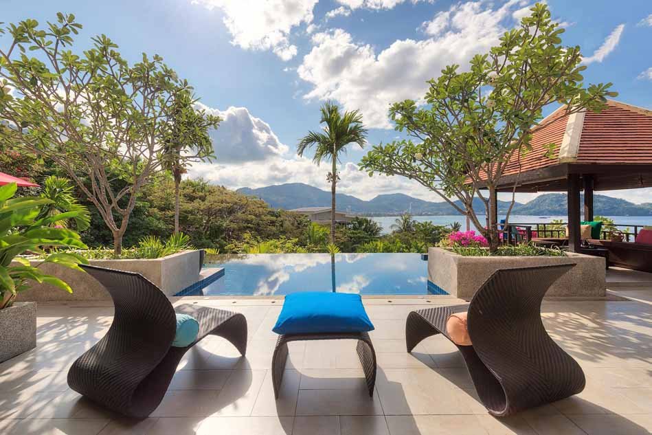 Overlooking the tranquil blue seas of Patong Bay, set high within an upscale Resort, the luxury villa offers panoramic ocean and mountain views. With high quality standards and a special attention to details, the villa provides a generous living space including 4 large bedrooms and 6 bathrooms across two main floors plus a large pool, terrace and garden areas.