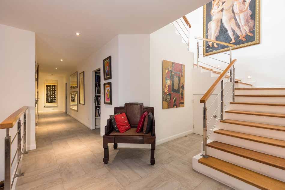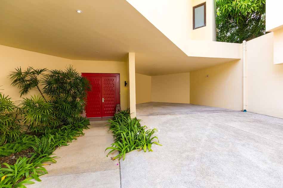 The lower floor has a large entrance foyer plus a further three en-suite bedrooms, a library, en-suite maid’s and laundry rooms and generous storage areas. Each bedroom opens to a small private garden terrace and enjoys the greenery and sea views. There is ample covered car parking for two cars as well as a private garden area along the driveway.