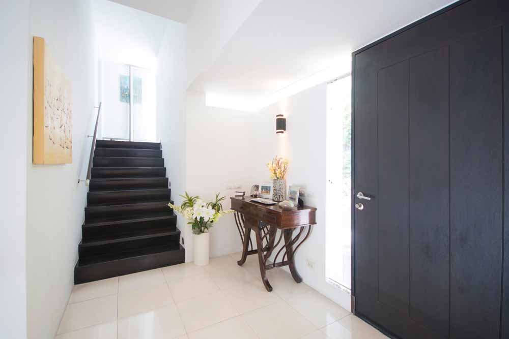 This villa has 400 sqm of built area, across four floors. The entrance is on the second highest floor, as is the two-car garage and paved driveway for a further two cars. Across the threshold, a small foyer awaits. In front the light, spacious and open-plan lounge, dining and kitchen. To the right, stairs up to the roomy master bedroom suite.