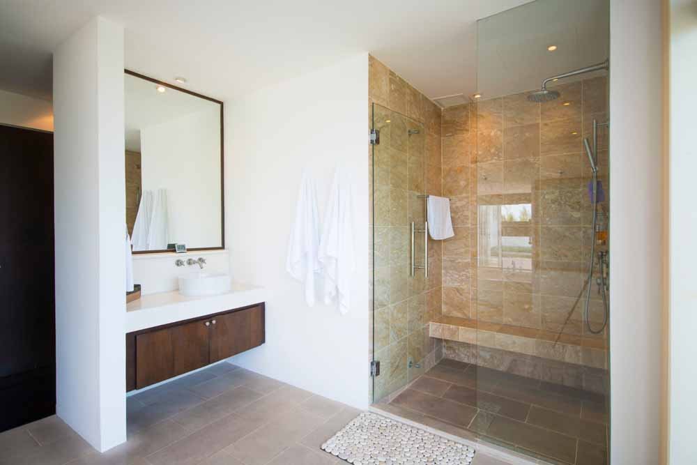The master bedroom is complete with four poster bed, private sea view balcony and a stunning bathroom with a large white terrazzo bathtub. Beautiful timber floors are laid throughout the large bedroom.