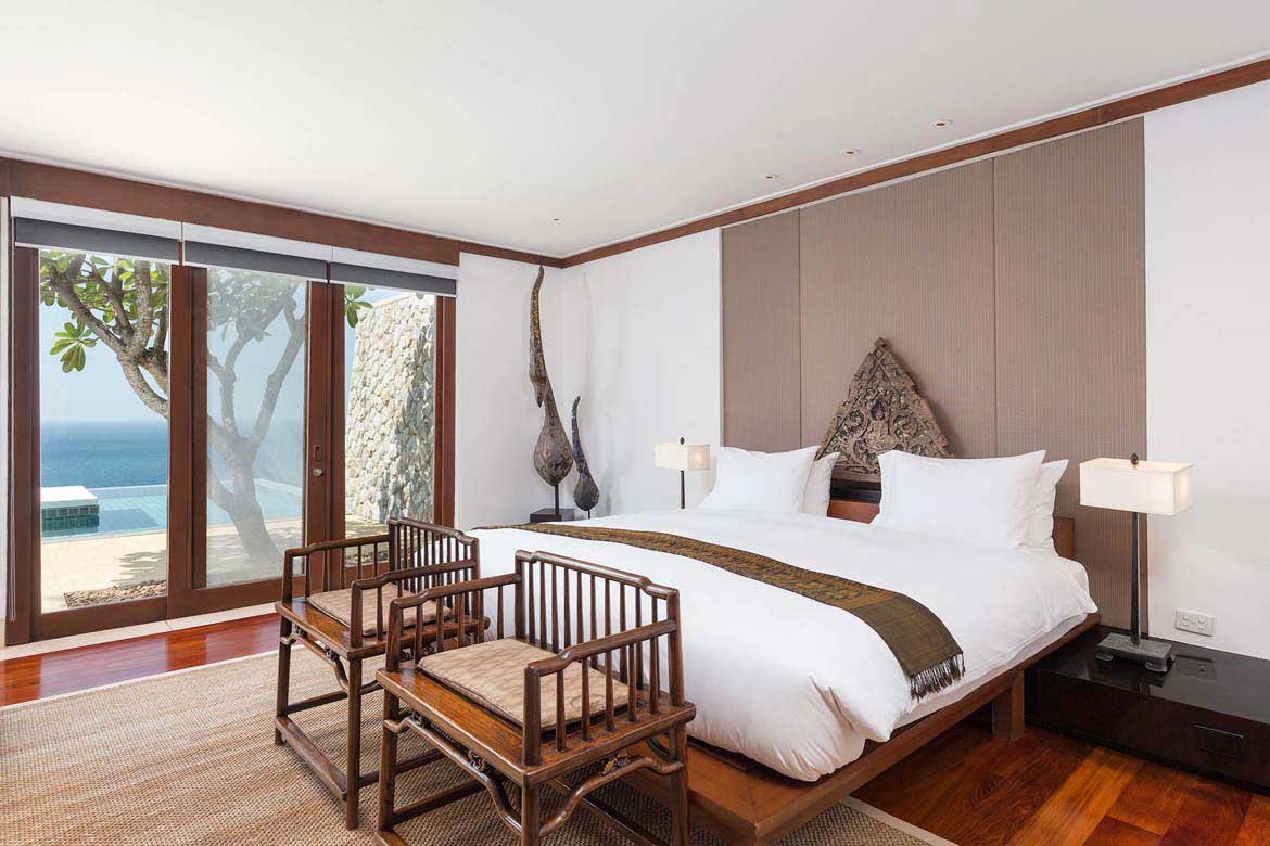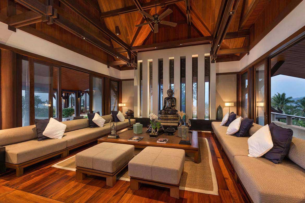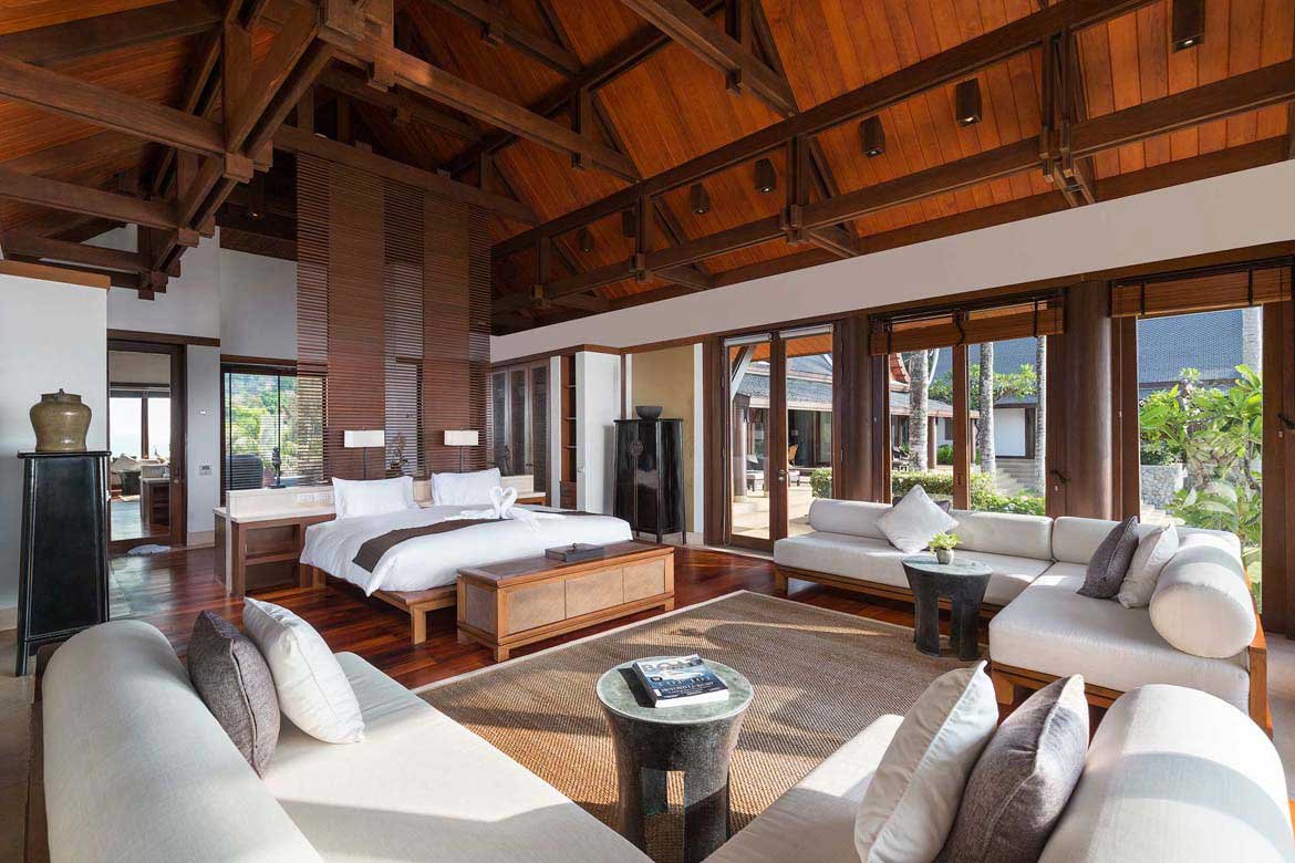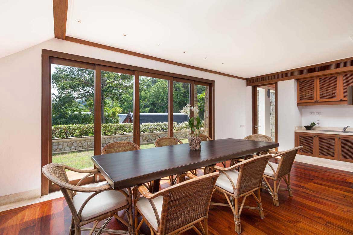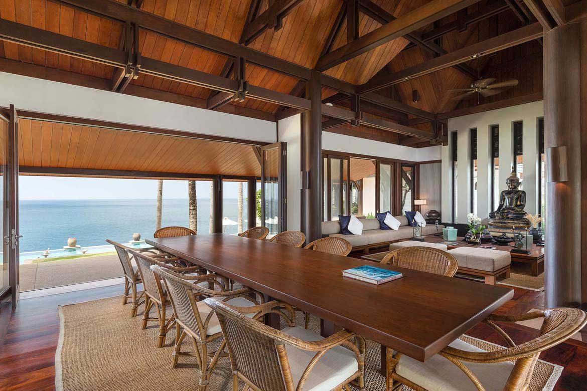 Situated within a secure and private oceanfront estate at Kamala, this Jean-Michel Gathy designed home follows closely the Aman style, with high, teak lined, vaulted ceilings in the main living and dining areas and master bedrooms.