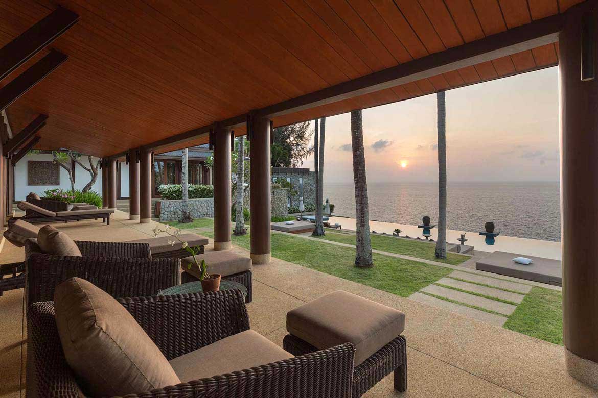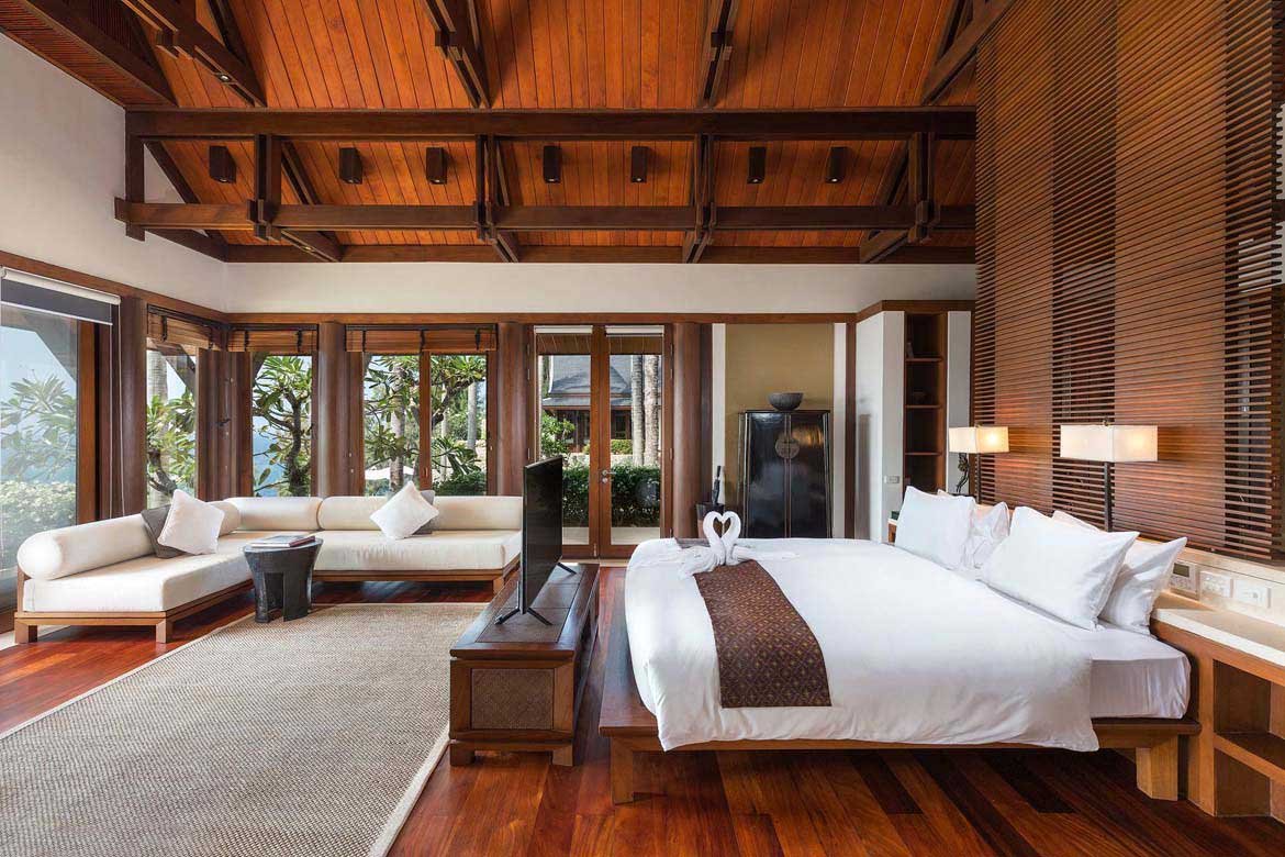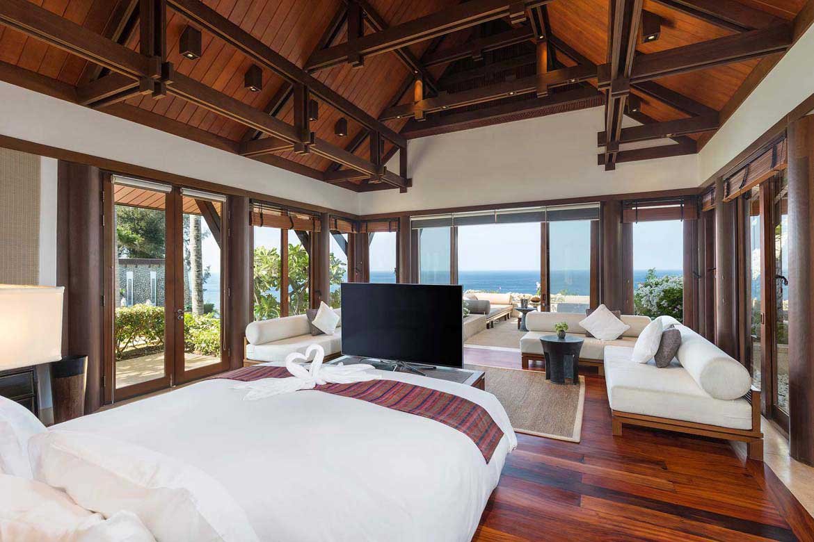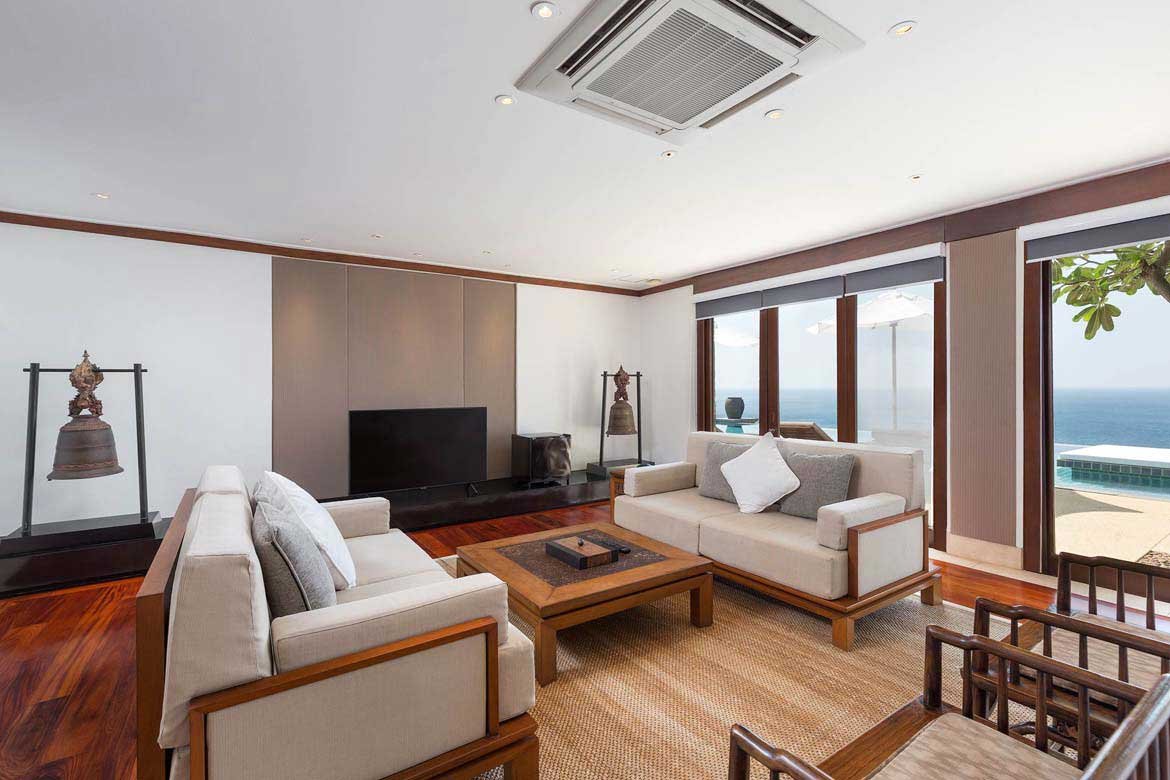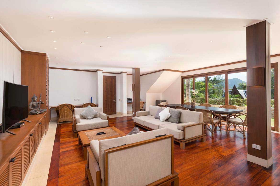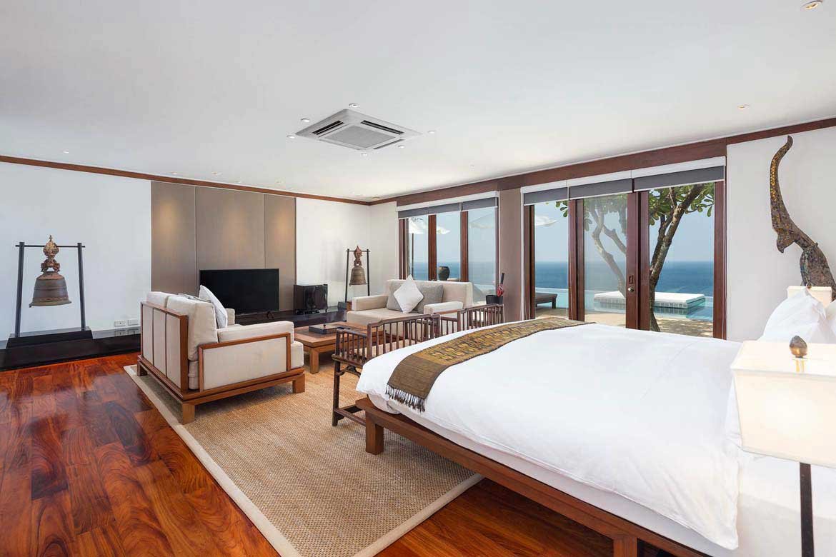 Situated within a secure and private oceanfront estate at Kamala, this Jean-Michel Gathy designed home follows closely the Aman style, with high, teak lined, vaulted ceilings in the main living and dining areas and master bedrooms.