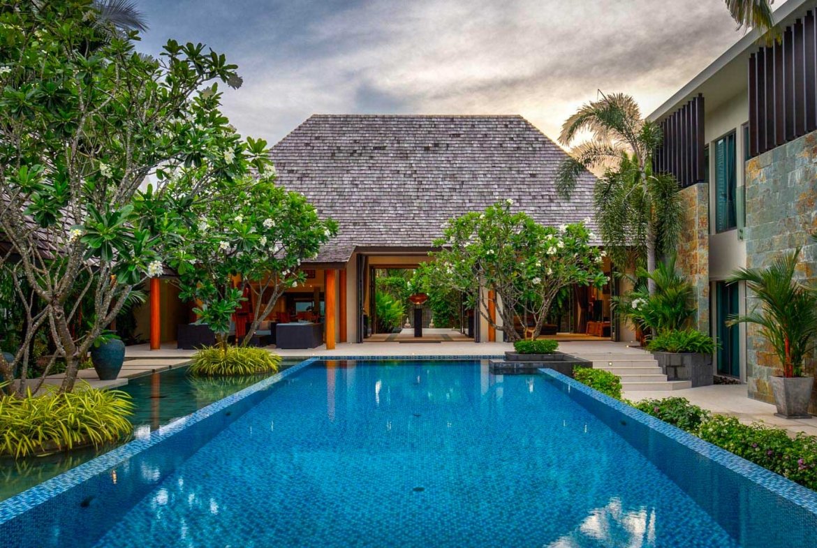 Arranged as a courtyard estate the villa has a scale that impresses featuring a land plot approaching 1,500 sqm with five connected buildings arranged around a large resort-sized central swimming pool. Creating a totally private enclosure, the main rooms are planned to share relaxing views onto the pool, the reflective ponds and tropical gardens, with a mix of public and private spaces. A bespoke villa, it is a timeless and beautiful indoor-outdoor tropical home, always bright and always breezy, made elegant with carefully chosen imported Italian tiles and the use of natural and light coloured materials that compliment the overall design and workmanship.