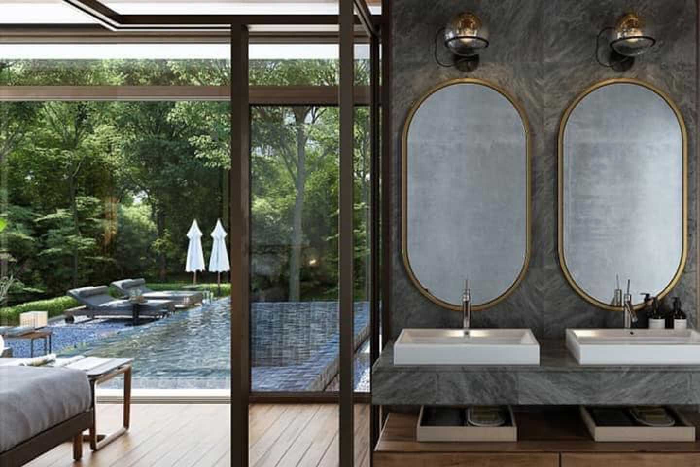 The villa features a natural stone tiled swimming pool with a free-flowing open floor plan capped by a vaulted ceiling and framed by glass doors.