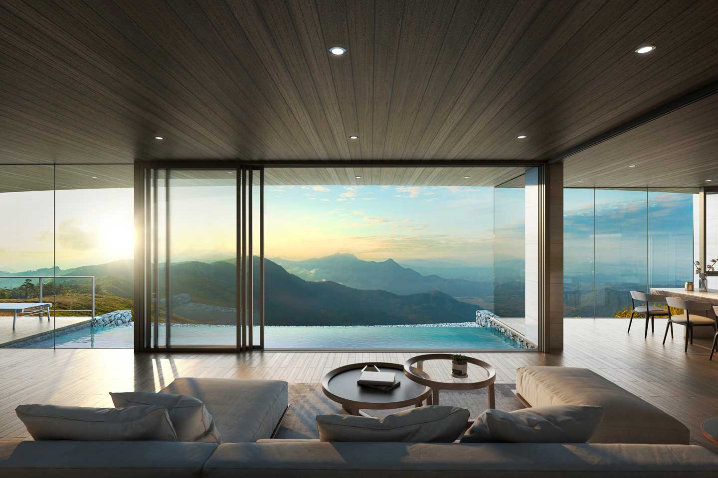 The villas provide surrounding views to residents from each room and maximize living areas in a panoramic view .