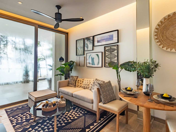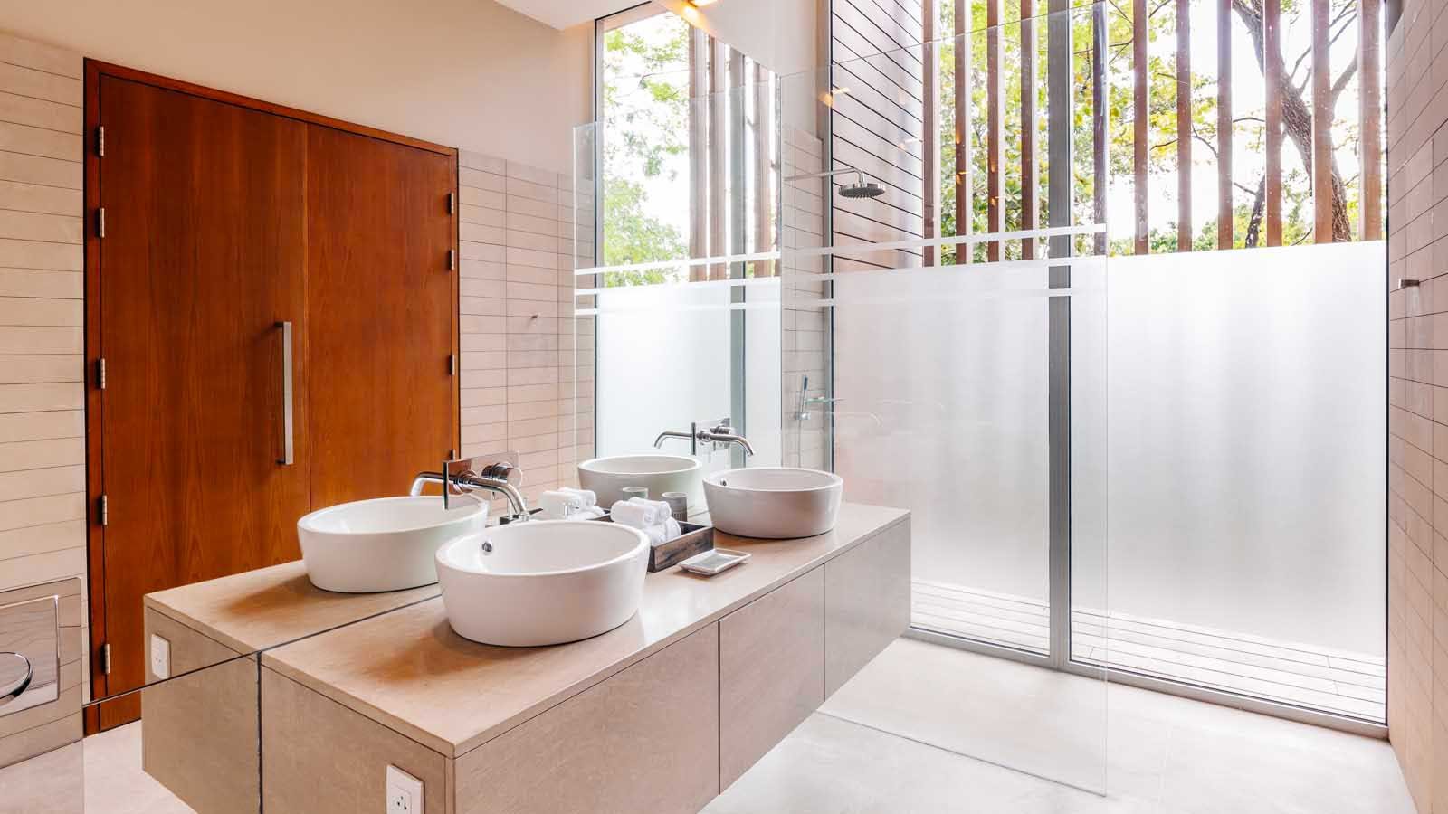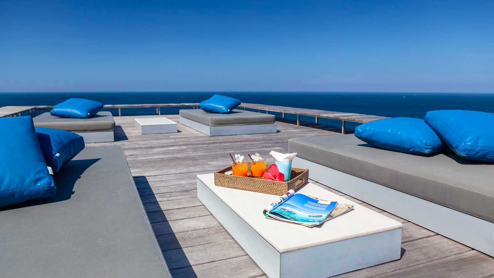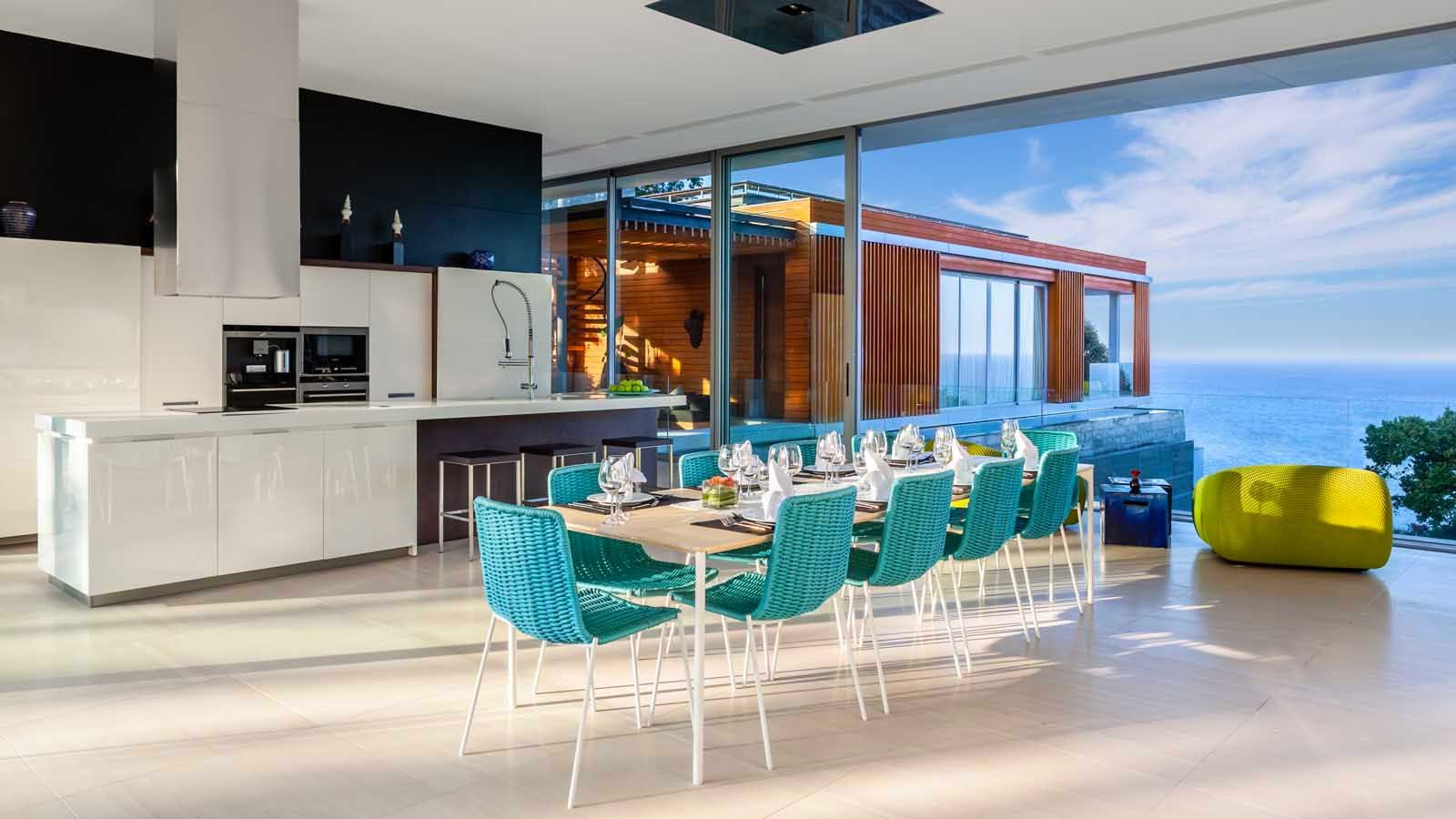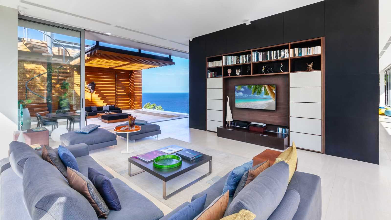 The villa has three distinct structural areas aligned in an ‘S’ shape when viewed from above. The central and most obvious part is the massive ‘floating’ main living / dining and show kitchen area which runs parallel to the oceanfront and overlooks the especially wide 21m x 5m main swimming pool and relaxation and sunbathing areas.