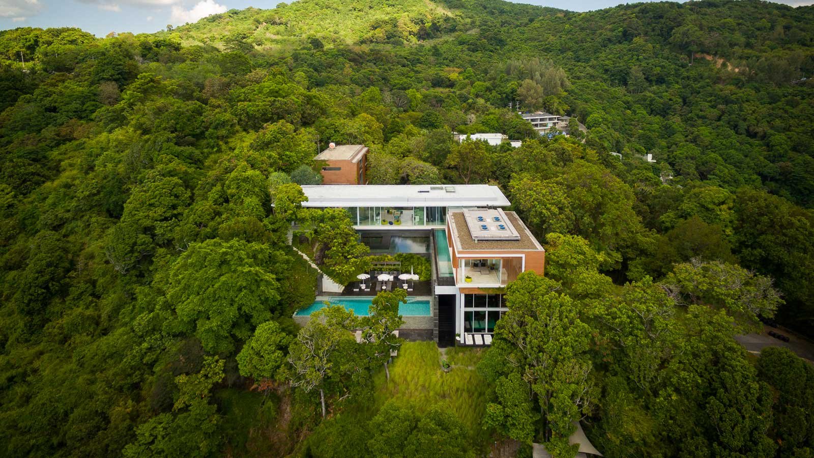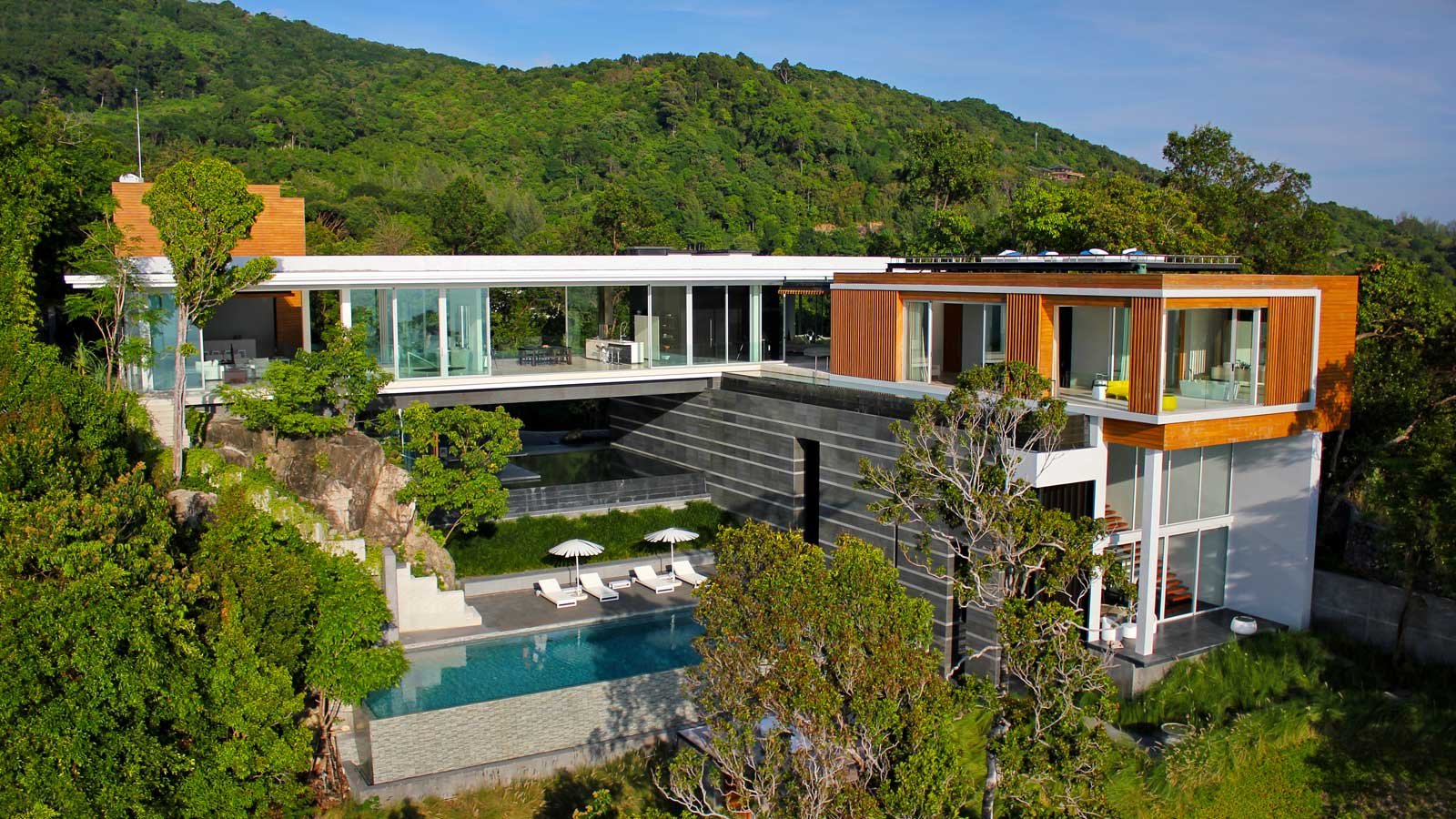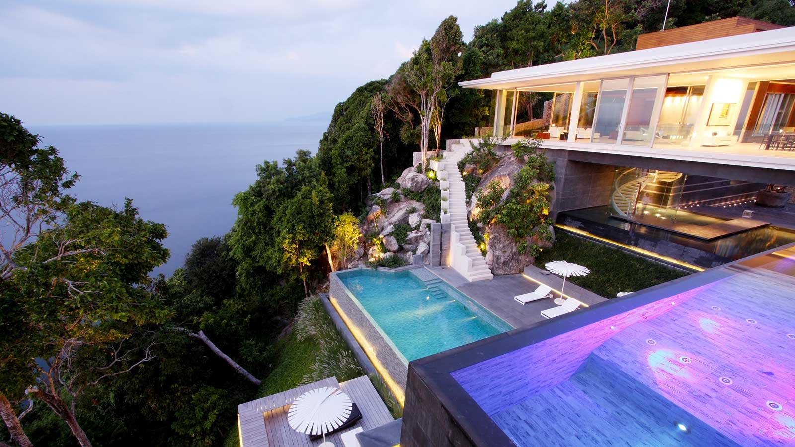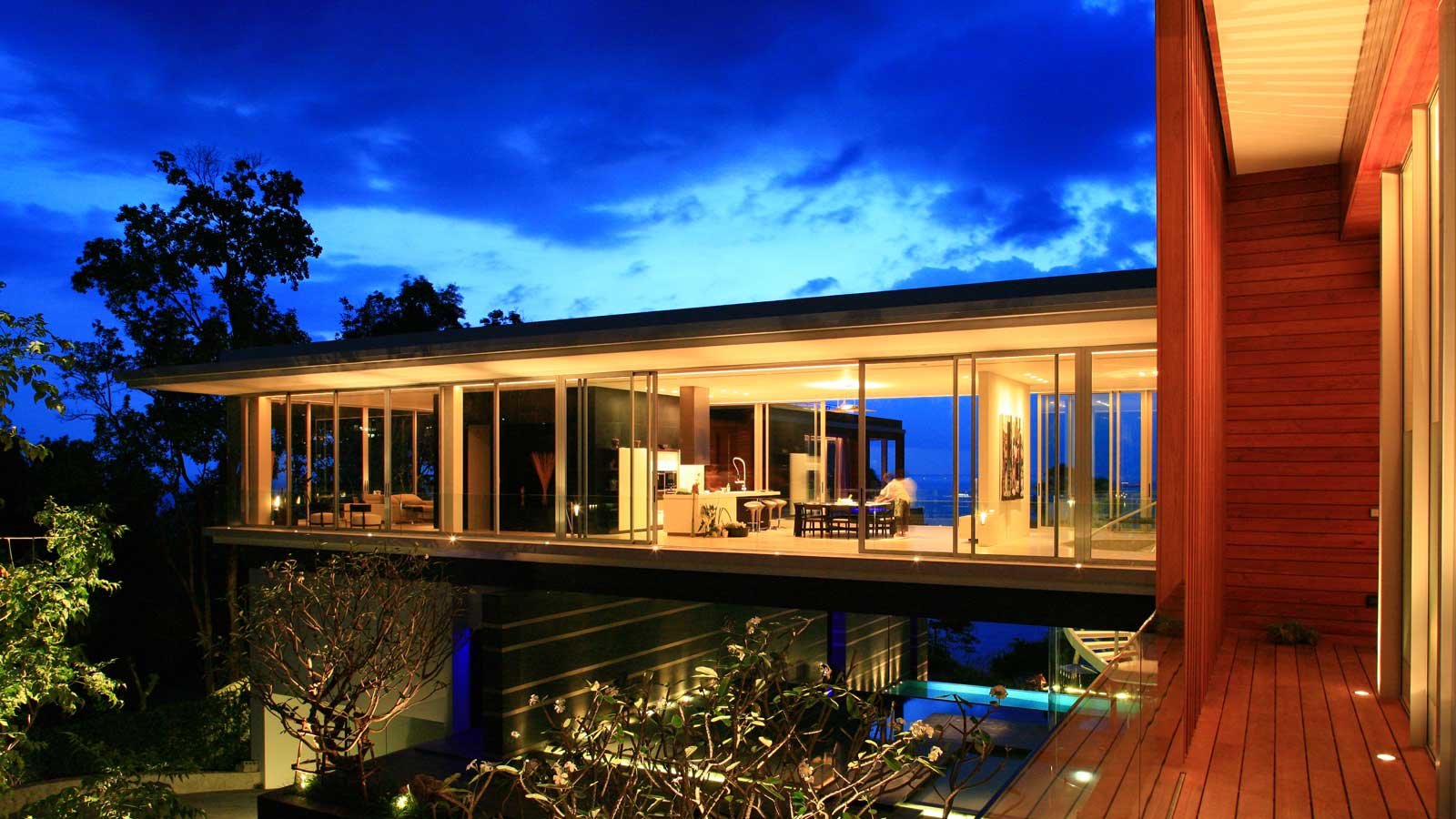 The exclusive luxury villa is certainly the apogee of modern Phuket oceanfront villa design. Big bold, linear lines and large glass expanses overlooking the Andaman sea, set the scene of a design that seems to befit a James Bond Movie set. Amongst many who have visited it is even known as, “The James Bond Villa’.