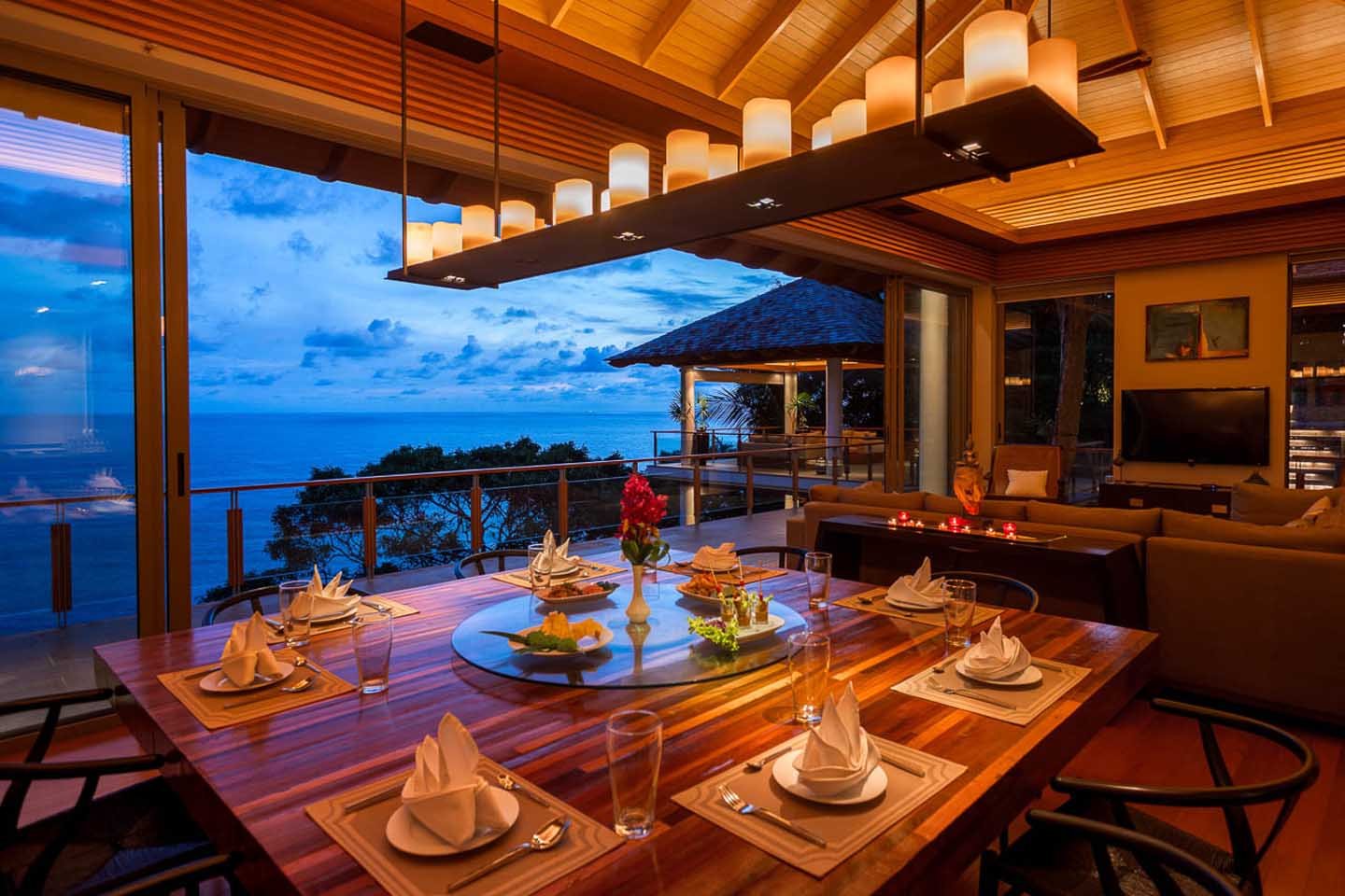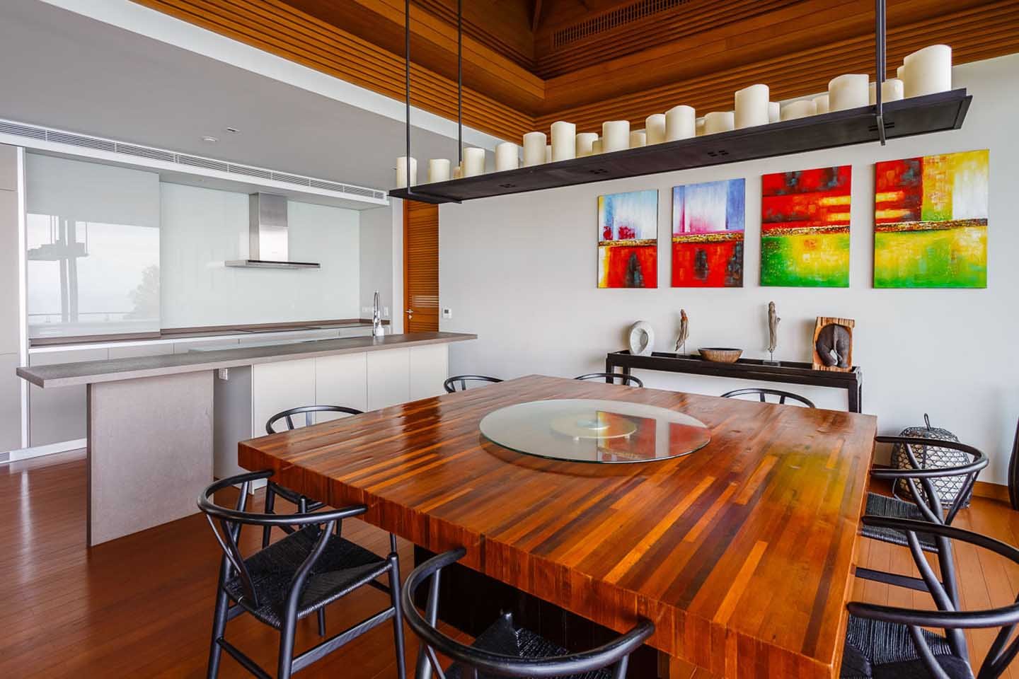 The luxury villa seamlessly integrates living and dining spaces, with an upper level featuring a fully equipped kitchen, dining room, and a comfortable living room. Open up to the sea breeze or enjoy air-conditioned comfort while relishing in Thai-style alfresco dining amidst lush foliage and breathtakingly stunning ocean views.