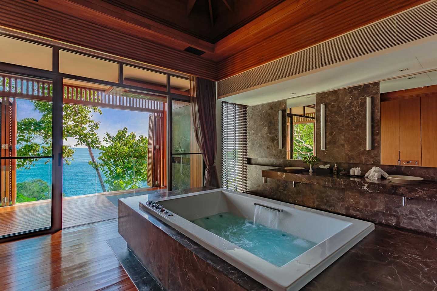 Gaze upon the Andaman Sea from the expansive 19-meter lap pool, indulge in indoor and outdoor lounging, and maintain your fitness regimen in a well-equipped gym. Exclusive access to a rocky bay below enhances the villa’s allure, offering a sea-facing vista that becomes particularly enchanting at sunset.