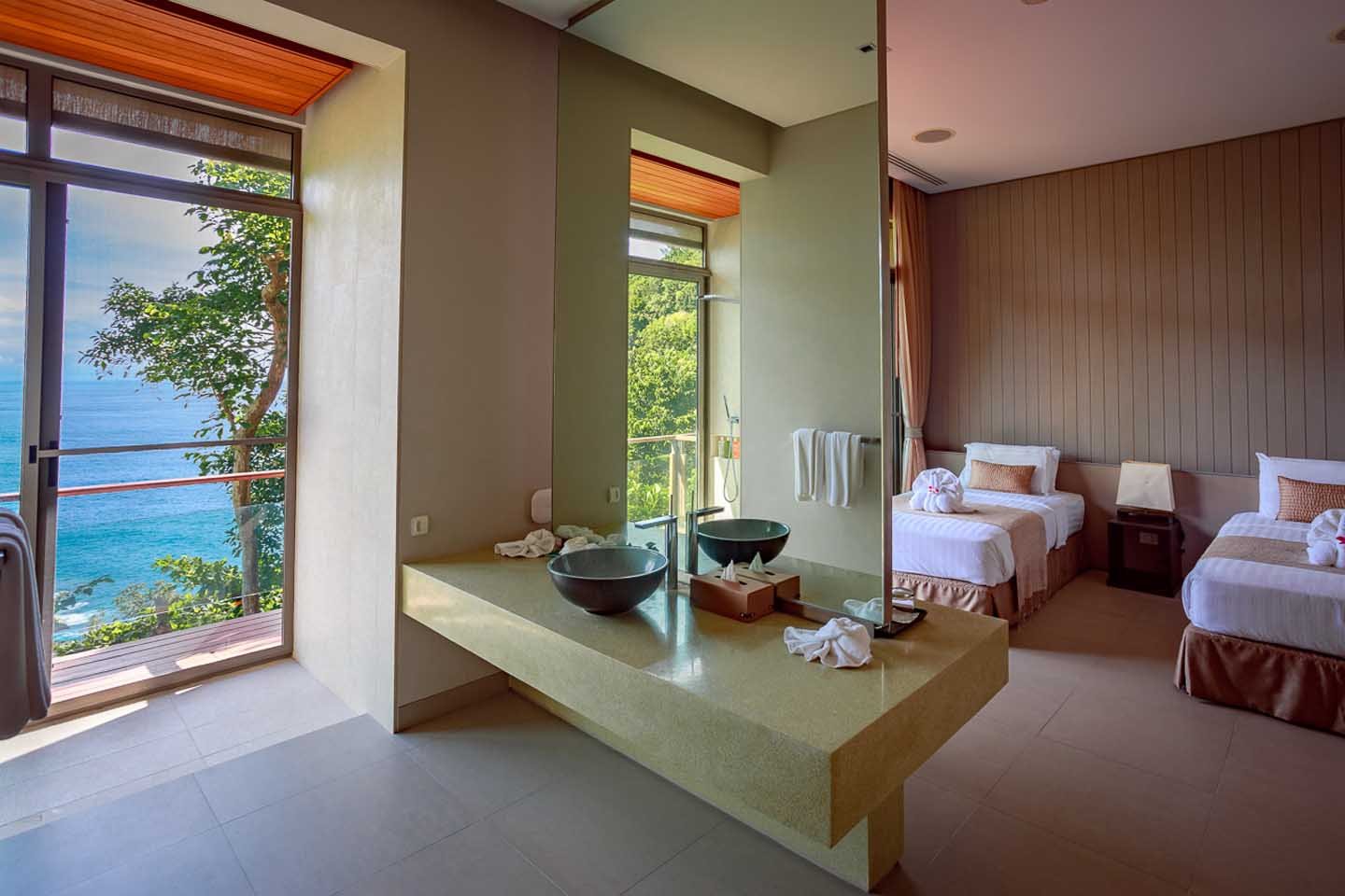 Every bedroom treats guests to a mesmerizing ocean panorama, complete with flat-screen TVs, and home entertainment systems. The ensuite bathrooms, characterized by high ceilings and luxurious natural stone, rival the grandeur of the bedrooms themselves.