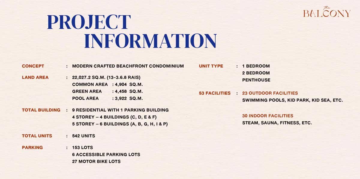The Balcony embraces a modern coastal aesthetic inspired by relaxed seaside living. Low-rise buildings (4-5 floors across 9 blocks) ensure a boutique feel with low density—only 542 units total on generous land—preserving open spaces and sea breezes.