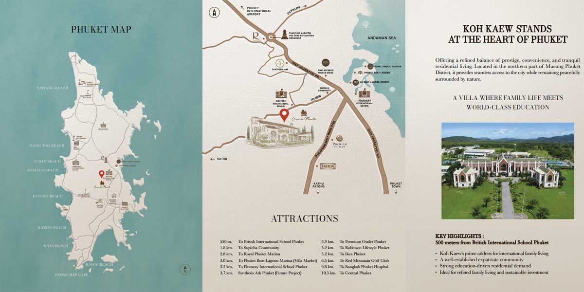 Casa de Monte sits in tranquil Koh Kaew, only 13.5 km from vibrant Patong yet worlds away from the hustle. You’re surrounded by leading international schools (HeadStart, Kajonkiet, and British International School nearby), top hospitals, and everyday conveniences like Central Phuket and Big C. Quiet beaches such as Khao Kad and Ao Yon are minutes away, while the airport is a smooth 30 minute drive. This balanced location appeals to families, expats, and professionals who want Phuket’s lifestyle without the tourist intensity — perfect for building a permanent base.