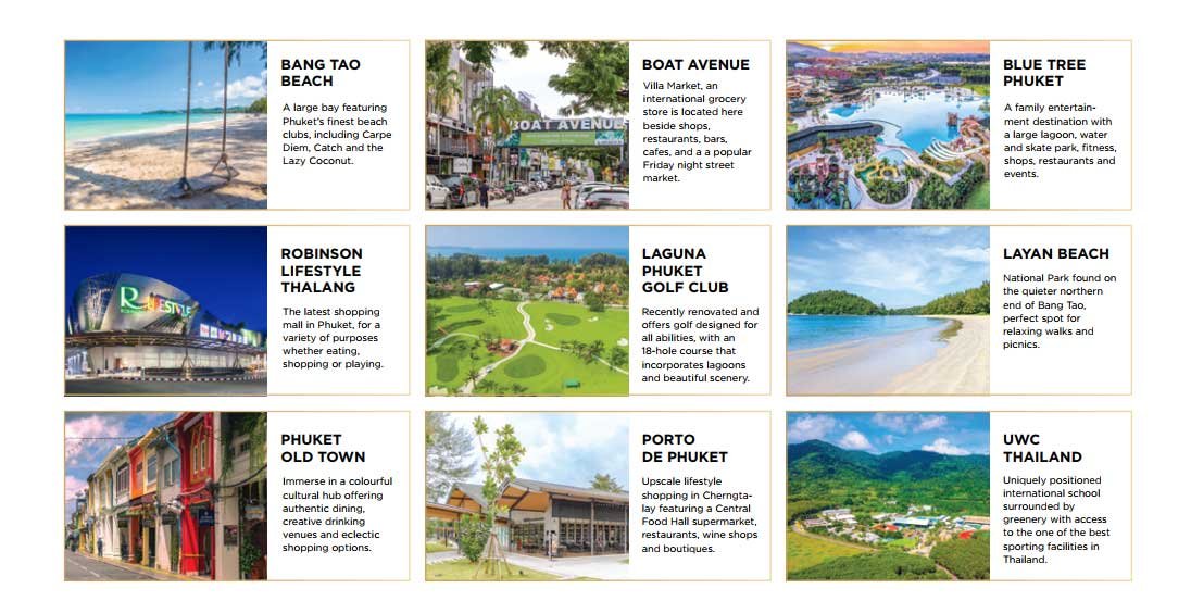 British Internataional School Phuket (BIS), United World College Thailand (UWCT), Boat Lagoon, Royal Phuket Marina, Ao Por Grand Marina, Mission Hills Golf Course, Phuket International Airport, Central Festival and Red Mountain Golf Course are less than 20 mins away.